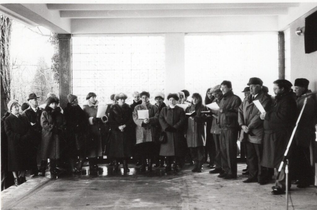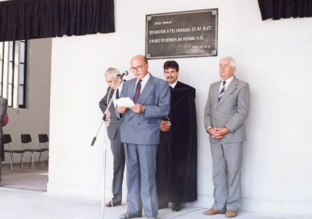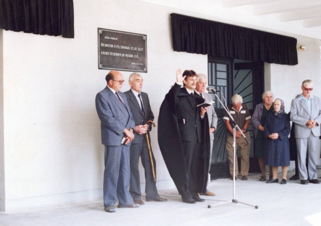 1992. szeptember 16. Hálaadó istentisztelet az 1950-es években az állam által elvett ravatalozónál, melyet a gyülekezet 1992-ben a város által felújítva kapott vissza.