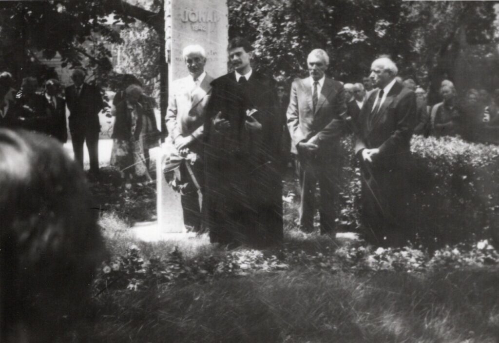 1992. április 5. Koszorúzás a pápai Jókai-emlékműnél. Kerekes József gondnok, nt. Fazekas László, Mészáros László gondnok