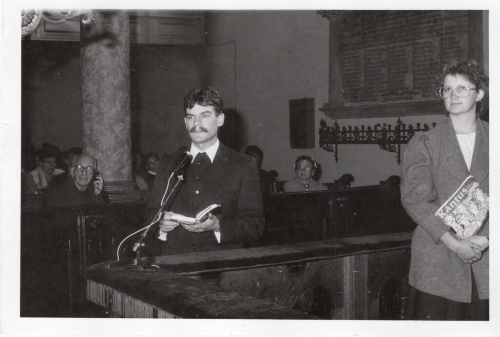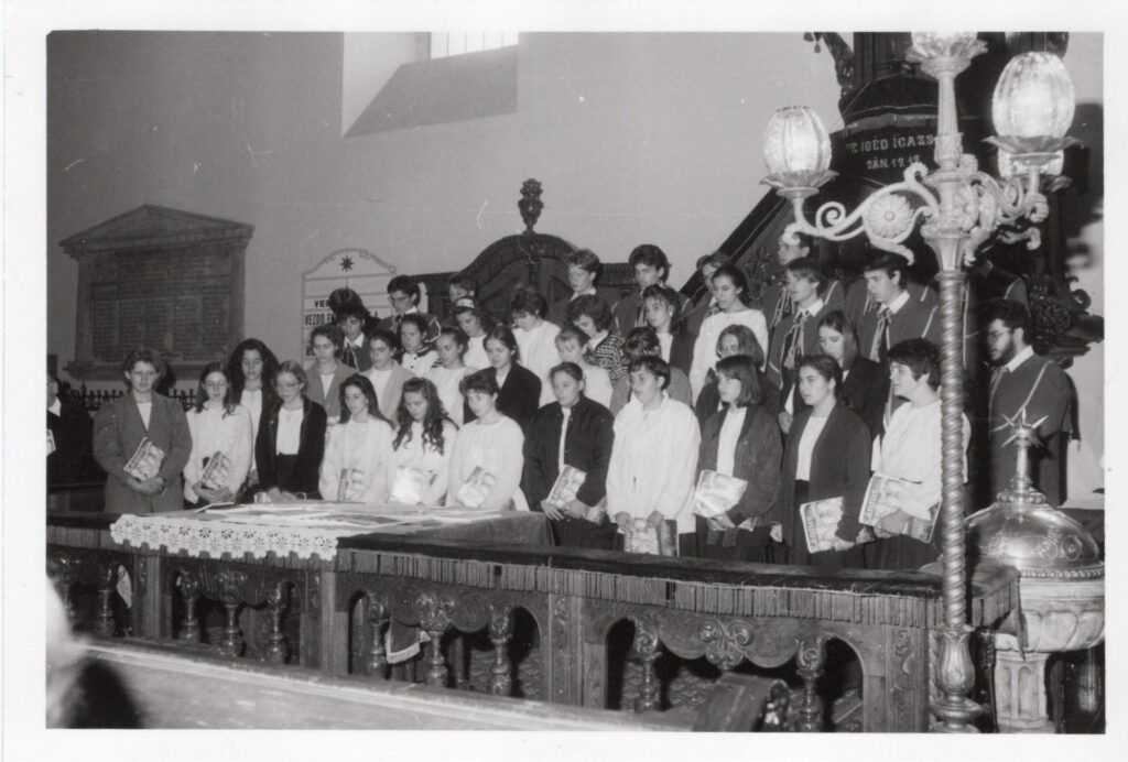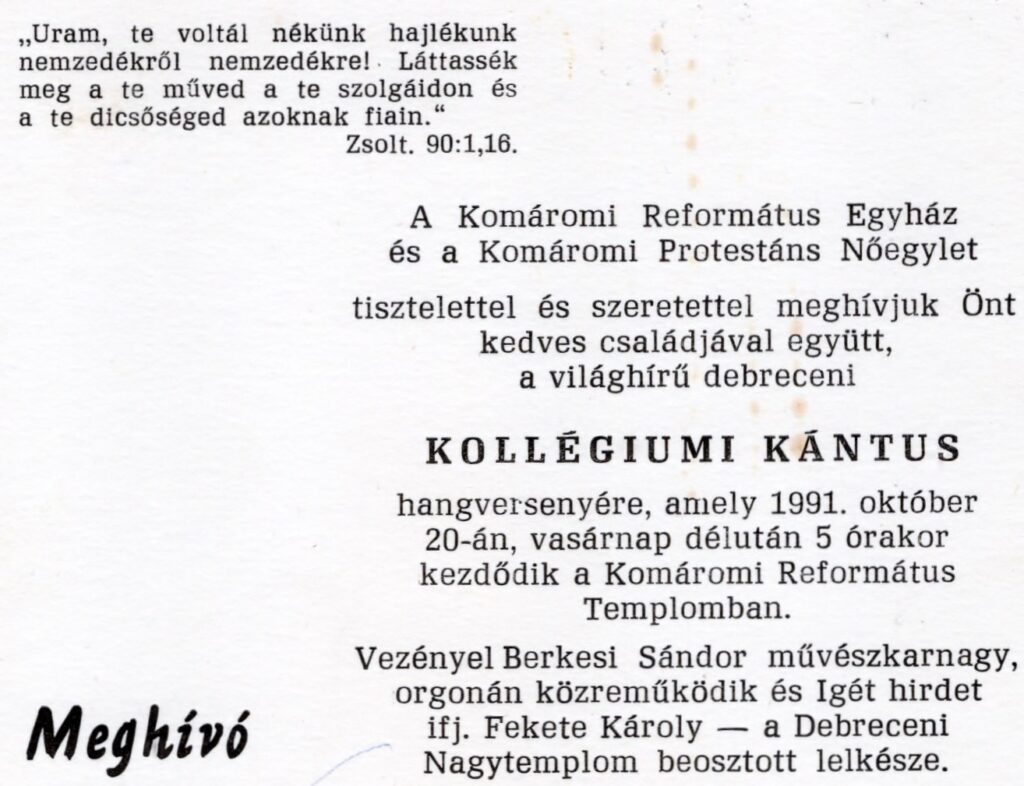 1991. május 16. Konfirmáció – Nt. Fazekas László, n. Kerekes József, n. Mészáros László gondnokok. Konfirmandusok: Kalitza Katalin, Ambláczky Katalin, Fazekas Péter, Horváth Zsuzsanna, n. Kalitza Andrea, Polgár József1991.5.16.1991. június 2. Nt. Dobos Károly alagitéri lelkipásztor, a Magyarországi Lepramisszió megalapítója a Selye János Gimnázium aulájában1991. június 2. Fazekas László, Dobos Károly és Acsay Irma diakonissza, aki Komáromba hozta a Lepramisszió szolgálatát.1991. június 2. Oláh Imréné Domonkos Ilona, a Protestáns Nőegylet elnöknője. A Lepramissziót gyülekezetünkben a Protestáns Nőegylet alapította.1991. június 2. A Lepramisszió munkája iránt érdeklődők.1991. július 7. Ft. Mikó Jenő püspök beiktatja gyülekezeti lelkipásztori szolgálatába nt. Fazekas Lászlót, aki komáromi segédlelkészi évei után 1,5 évig adminisztrátor lelkészként szolgált Léván, majd a Révkomáromi Református Egyházközség 1991. február 3-án lelkipásztorává választotta.1991. július 7.1991. július 7. n. Takács Zoltán, egyházunk főgondnoka és n. Nagy Antal, gyülekezetünk gondnoka.1991. július 7. Szénássy Árpádné, n. Szénássy Árpád, polgármester – helyettes és Pásztor István Komárom polgármestere.1991. július 7. Tamás Márta, id. Fazekas Lászlóné, id. Fazekas László, Tamás Róbert1991. július 7. Nt. Dobay Sándor, dunamocsi és nt. Erdélyi Pál vágfarkasdi lelkipásztorok (a képen még teológusok)1991. július 7. Farnbauer Béláné Galambos Lídia (a Lepramisszió későbbi vezetője), Cséplő Bálintné, Rumann Nóra1991. augusztus 25. Konfirmáció: Boross Kornél, Lévay Adrián, Hajmássy Zsanett, Lévay Sarolta, Nagy Katalin, Cséplő Krisztina, Dráfi Anikó1991. augusztus 25. Csoma László, Varga András, Dumbier Ferenc, Horváth Gábor, Nagy Olga.1991. október 20. Templomunkban szolgál a debreceni Kántus.1991. október 20. A debreceni Kollégiumi Kántus1991. október 20. Nt. Fazekas László köszönti a kórust.A 23 tagú 1 éves ifjúsági énekkar felveszi a Collegium Musicum nevet. Csiba Krisztina, Rácz Csaba, ifj. Fazekas László, Mórocz Ildikó, Takács Katalin, Egyházi Ágnes, Ambláczky Katalin, Fehérváry Zsófia, Koczkás Andrea, Nagy Katalin, Sebők Éva, Nagy Andrea, nt. Fazekas László, Viktória Gulyás, Lévay Sarolta, Rácz Tibor, Rácz Zoltán, Mácza Miklós, ifj. Szabó Pál, Darázs Lajos, Básti Péter, Fekete Vince